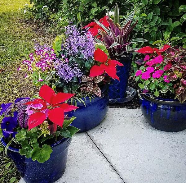We recently moved into a newly constructed home, so my garden is a work in progress for the time being. It's mostly container gardens as I've been getting acquainted with the light conditions, irrigation, and drainage. The trees still have yet to fill in, which will dramatically affect the sun exposure in the future. So as exciting as it's been to move into a new home, the garden will have to evolve over time. But, I have about a dozen or more containers of all sizes that I keep planted up. I have a thing for blue, so all my pots are cobalt blue. I find it's an easy color to work with for each season and/or holiday. So far, what I have planted in my beds has been a mix of perennials in blues, purples, and whites.